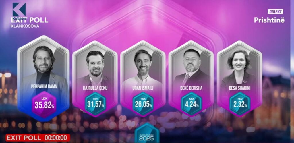 Radiotelevizioni Dukagjini në bashkëpunim me UBO Consulting, po prezanton Exit Poll-in për 12 komuna për zgjedhjet lokale 2025: Prishtinë, Mitrovicë, Pejë, Prizren, Ferizaj, Gjilan, Gjakovë, Lipjan, Podujevë, Fushë Kosovë, Istog, Suharekë. Prishtina sipas Exit Poll-it ka balotazh. Përparim Rama i LDK-së është renditur i pari me 34.3%, Hajrulla Çeku i LVV-së i dyti me 32.1%, pas tij Uran Ismaili i PDK-së, me 28.9%, Bekë Berisha i AAK-së 2.8% dhe Besa Shahini e PSD-së, 1.7%, raporton Kallxo.