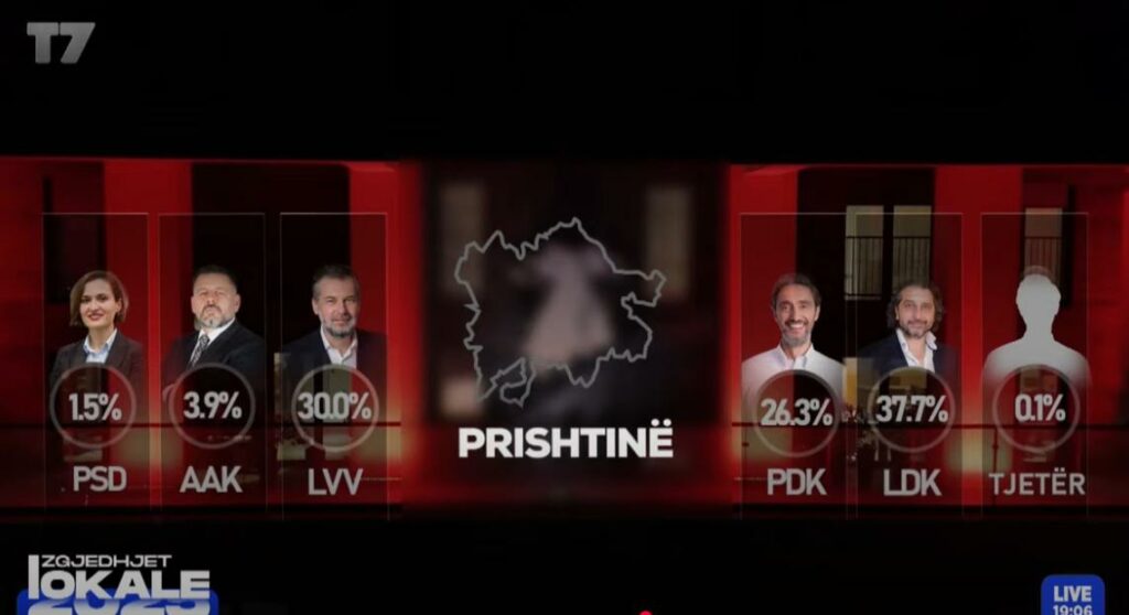 Sipas Exit Poll të televizionit T7, në Komunën e Prishtinës kanë shkuar në balotazh: Përparim Rama 37.7%, Hajrulla Çeku 30.0%, Uran Ismaili 26.3%, Bekë Berisha 3.9%, Besa Shahini 1.5%.